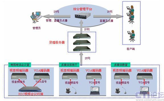 對于電視電話會議的錄播,可以將視頻會議終端的視音頻信號和VGA信號(視頻會議中的“雙流”)輸入到視音頻編碼器和VGA編碼器上,由視音頻編碼器和VGA編碼器將音視頻信號和VGA信號進行編碼,編碼后通過網(wǎng)絡傳給錄播服務器進行信號處理、整合,最終傳輸?shù)骄C合管理平臺上。
