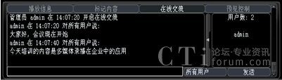 系統(tǒng)增加了多方文字互動交流功能,在線交流功能可以選擇給所有人員發(fā)送消息,也可以選擇給某一特定人員發(fā)送。這樣在會議或培訓(xùn)的過程中,管理員可以選擇性的提出相應(yīng)的問題給相關(guān)人員,考核相關(guān)人員的培訓(xùn)效果;其他人員也可以將會議或培訓(xùn)過程中遇到的疑問、難點及時的反應(yīng)給管理員進(jìn)行解答,增強(qiáng)會議或培訓(xùn)的成效。