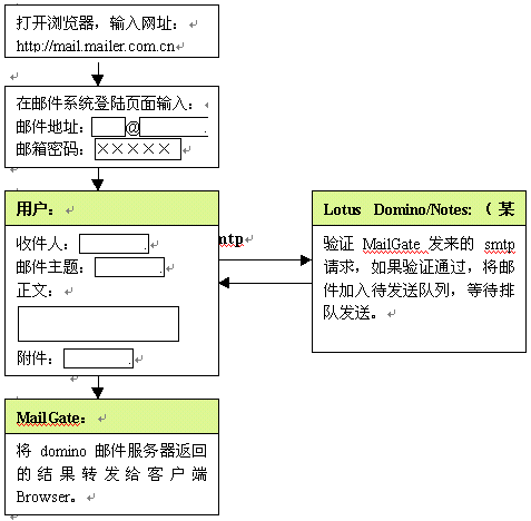 金笛郵件網(wǎng)關(guān)完全基于B/S架構(gòu)的設(shè)計,使得郵件收發(fā)、管理都是基于瀏覽器完成,客戶端只要打開IE瀏覽器即可,無需做任何設(shè)置,大大方便了用戶。也就是說,在城域網(wǎng)任一節(jié)點(diǎn),都可以通過內(nèi)部域名(DNS)訪問郵件網(wǎng)關(guān),然后通過郵件網(wǎng)關(guān)與用戶所在的domino郵件服務(wù)器通訊,將郵件主題、郵件內(nèi)容顯示在web頁面上。金笛?郵件網(wǎng)關(guān)的具體工作流程如下: