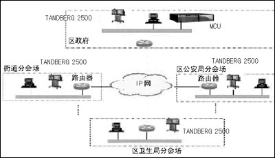 此次應(yīng)用的視頻會議終端位于東城區(qū)政府所轄范圍內(nèi)的各重要單位,通過H.323網(wǎng)絡(luò)召開內(nèi)部工作會議,從而方便地實現(xiàn)實時交互式遠程會議,會議電視系統(tǒng)設(shè)計使用速率支持1.5Mbps,控制方式采用全網(wǎng)星型集中式控制方式。