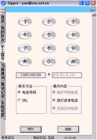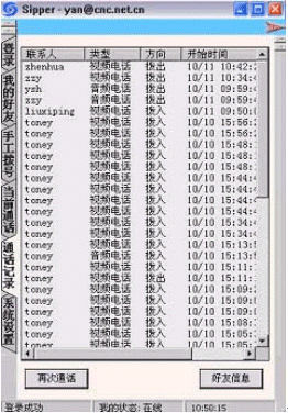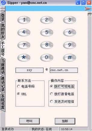 點擊后會出現(xiàn)對話窗口,同時在對方的機器上會出現(xiàn)你的呼叫請求,如果對方"接收"了你的請求,則兩個人的語音對話開始,雙方可以互相聽到聲音,沒有圖象,可以同時進行短信交流。