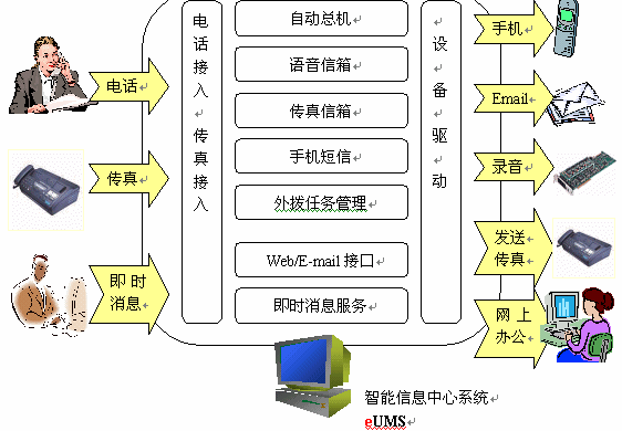 整個系統(tǒng)以eUMS服務器為核心,對內連接企業(yè)局域網,對外連接互聯(lián)網。eUMS內配置一塊語音/傳真卡,負責電話、傳真的接入。如果企業(yè)需要自己的短信服務,也可以在eUMS服務器上安裝手機短信網關,外接一部手機即可。
