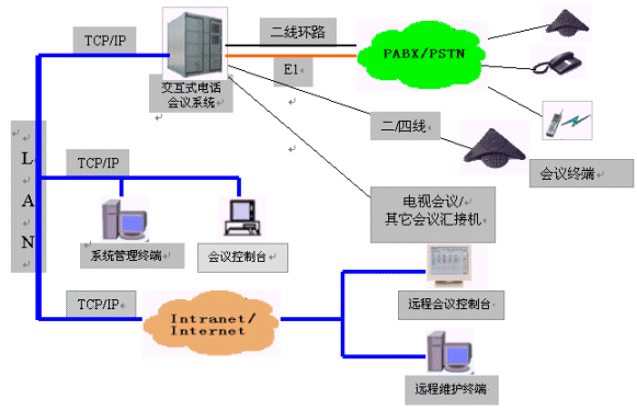 MCU-NT/I交互式電話會(huì)議系統(tǒng)為會(huì)議用戶提供了強(qiáng)大靈活的會(huì)議功能和豐富完善的網(wǎng)管功能。會(huì)議功能是在會(huì)議終端(或話機(jī))和會(huì)議控制臺(tái)上實(shí)現(xiàn)的;網(wǎng)管功能是在系統(tǒng)維護(hù)終端上實(shí)現(xiàn)的,并在靈活的組網(wǎng)方式中體現(xiàn)出它的方便易用。系統(tǒng)可以外接多個(gè)會(huì)議控制臺(tái)及多個(gè)系統(tǒng)維護(hù)終端,并且可以通過(guò)企業(yè)網(wǎng)或互聯(lián)網(wǎng)的遠(yuǎn)程連接,因此,所有功能都是可以遠(yuǎn)程實(shí)現(xiàn)的。