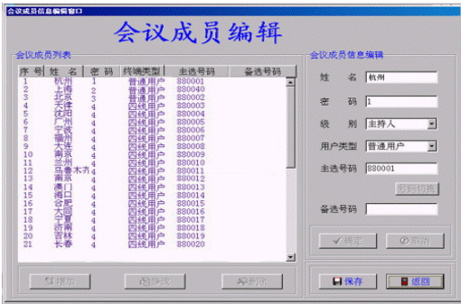 ·成員編輯:即設(shè)置會(huì)議成員數(shù)據(jù)。進(jìn)行會(huì)議操作之前必須先設(shè)置會(huì)議成員數(shù)據(jù)。會(huì)議成員數(shù)據(jù)包括:人員姓名、常用號(hào)碼、備用號(hào)碼、密碼、級(jí)別(會(huì)議主持人、發(fā)言人、聽(tīng)眾)。會(huì)議主持人一個(gè),會(huì)議成員個(gè)數(shù)不限,但總數(shù)不超過(guò)180個(gè)。