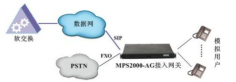 MPS2000-AG接入網(wǎng)關(guān)可提供多種接口,如IP接口、FXS、FXO等,使其具有強(qiáng)大的組網(wǎng)能力。其組網(wǎng)如下所示。