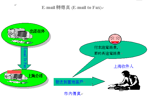 特別值得一提的是,E-mail轉(zhuǎn)傳真功能還能節(jié)省很多長(zhǎng)途電話(huà)費(fèi),如李先生出差在香港,需要將傳真發(fā)回公司所在地上海的客戶(hù),通過(guò)E-mail將傳真發(fā)送到上海公司的伺服器,伺服器再將傳真發(fā)送到李先生上海的客戶(hù)處,如此一來(lái),國(guó)際長(zhǎng)途傳真只收市話(huà)費(fèi),何樂(lè)而不為呢?!