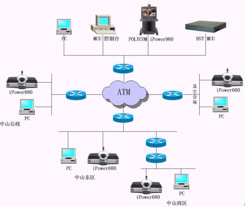 中山公安項(xiàng)目使用一臺(tái)DST H.323 MCS 3048/DFG的MCU、25套IPOWER600 SBRI終端和一套IPOWER900終端,目前終端使用4.01.408版本,通過(guò)的是IP OVER ATM網(wǎng)絡(luò),到每個(gè)會(huì)場(chǎng)的帶寬足夠---至少10M,會(huì)議召開(kāi)速率為768Kbps。市局會(huì)議中心采用IPOWER900,其它25個(gè)分局會(huì)場(chǎng)都使用IPOWER600。