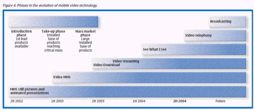 從諾基亞到其它公司,目前有許多具有視頻功能的手機(jī)紛紛出現(xiàn)在市面上。例如,60系列平臺包括了流媒體和視頻播放器功能。獲得60系列平臺許可證的公司有:諾基亞、松下、三星、Sendo和西門子,大致占有全球移動(dòng)終端市場份額的60%。目前市場上基于60系列的手機(jī)有:西門子的SX-1,三星的SGH-700,諾基亞的7650/3650以及諾基亞的N-Gage。這些手機(jī)立即為發(fā)展商和運(yùn)營商帶來了市場機(jī)遇,同時(shí)也為未來的60系列手機(jī)建立起一個(gè)統(tǒng)一的、可運(yùn)作的商業(yè)應(yīng)用市場。