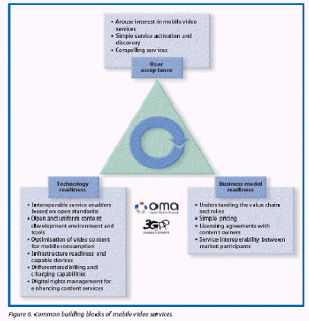 移動(dòng)視頻服務(wù)會成為其它已制定的多媒體應(yīng)用程序的一個(gè)補(bǔ)充。例如,電視并未因網(wǎng)絡(luò)的出現(xiàn)而消逝,同樣的,其它數(shù)字化或傳統(tǒng)的移動(dòng)傳輸應(yīng)用也不會因?yàn)橐苿?dòng)視頻的出現(xiàn)而消失。主要概況中略述了移動(dòng)視頻的好處。下面的文章則著眼于講述移動(dòng)視頻服務(wù)的普遍發(fā)展障礙,基于大規(guī)模市場的三個(gè)關(guān)鍵標(biāo)準(zhǔn)分別是:技術(shù)預(yù)備程度、商業(yè)模式預(yù)備程度和用戶接受程度。主要的觀點(diǎn)將做更細(xì)致的介紹。