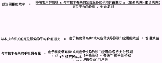 主要的因素有:終端客戶群的規(guī)模、定位平臺的投資、建設周期,請看下列公式(未經(jīng)實際統(tǒng)計驗證,僅僅用于估算):