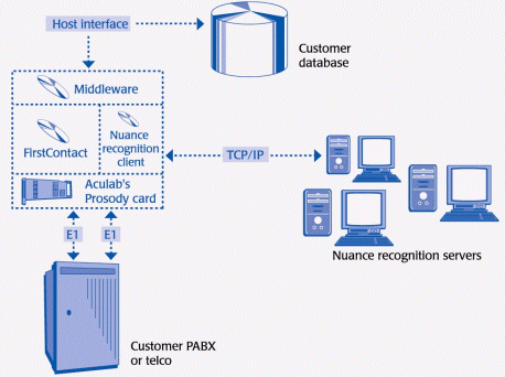 Prosody板卡位于系統(tǒng)的底層,已集成在VeCab系統(tǒng)中。FristContact 媒體服務(wù)器與Prosody硬件的通信是通過Aculab的統(tǒng)一API實(shí)現(xiàn)的。Prosody不僅用于TTS,而且也用于其它語音處理功能,例如放音、錄音、回音消除和DTMF檢測和生成。此外,VeCab 使用 Aculab的高密度數(shù)字網(wǎng)絡(luò)接口模塊來連接ACT的電話系統(tǒng)。