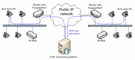 VoIP應(yīng)用的質(zhì)量監(jiān)控分為主動(dòng)式和被動(dòng)式兩種實(shí)現(xiàn)方式。主動(dòng)式的系統(tǒng)能產(chǎn)生呼叫,而被動(dòng)式的系統(tǒng)只是監(jiān)測進(jìn)行中的呼叫。兩種方法各有優(yōu)勢(shì)。VoIP監(jiān)控方案的架構(gòu)取決于網(wǎng)絡(luò)Edge設(shè)備的類型和結(jié)構(gòu)。有些大型企業(yè)采用的VoIP網(wǎng)絡(luò)配備了一種特殊設(shè)備,叫SBC(Session boarder controller),除了完成類似路由器的功能外,還能完成流量分配、數(shù)據(jù)/語音信號(hào)加密以及業(yè)務(wù)質(zhì)量控制等功能。此外,通過過濾和替換數(shù)據(jù)包內(nèi)的、與用戶有關(guān)的特定信息,SBC還能隱藏公司的網(wǎng)絡(luò)拓?fù)浣Y(jié)構(gòu)和用戶信息,不被外部的IP世界所知道。