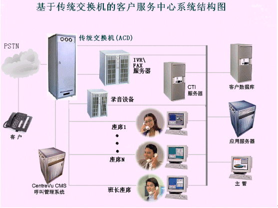 在以往大型CTI系統(tǒng)的設(shè)計中,這種模式是最常用的解決方案。傳統(tǒng)交換機(jī)由于其電信級標(biāo)準(zhǔn)的設(shè)計,接入容量大、交換處理能力強(qiáng)、性能穩(wěn)定,因而往往被大、中型呼叫中心用在前端構(gòu)成ACD系統(tǒng)(自動呼叫分配系統(tǒng))用來處理排隊(duì)、路由管理、坐席管理等功能。