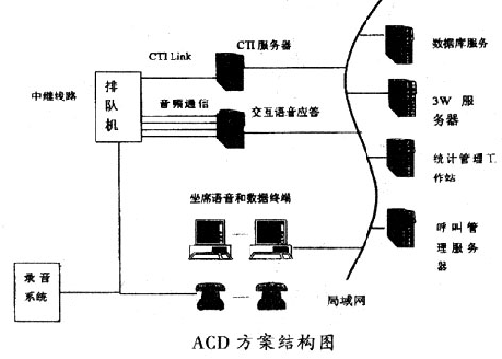 提供ACD方案的廠商傳統(tǒng)上是生產(chǎn)程控交換機的廠商。80年代以來,交換機廠家采取了以下發(fā)展策略:在增強路由能力的基礎(chǔ)上開放交換機的控制接口,以標準的軟、硬件格式提供CTI-Link,集成成熟的語音產(chǎn)品作為語音服務(wù)平臺。因此,ACD方案走的是一條基于CTI-Link標準、專業(yè)通信和計算機廠家利用各自優(yōu)勢分工合作的路。