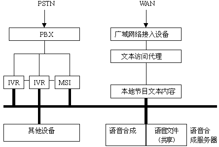 離線合成可以與省級甚至全國聲訊網(wǎng)絡結合,開發(fā)出靈活的聯(lián)網(wǎng)業(yè)務。即文本訪問代理從廣域網(wǎng)上取得節(jié)目文本數(shù)據(jù)存放于本地的文本數(shù)據(jù)共享目錄,語音合成服務器通過訪問該目錄獲取節(jié)目文本合成為語音文件存放與服務器的語音文件共享目錄中。局域網(wǎng)內(nèi)其他設備(IVR、MSI等等)訪問語音文件共享目錄,向用戶播放最新生成的語音信息。