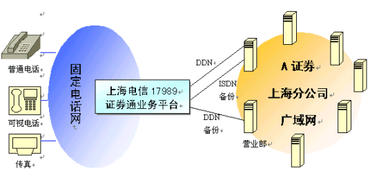 "17989證券通"服務(wù)是上海電信和黎明網(wǎng)絡(luò)共同向上海地區(qū)證券公司提供的通道外包式綜合服務(wù)。與電信提供的傳統(tǒng)的固定通道收費服務(wù)不同,"17989證券通"服務(wù)的顯著特色是"集中交易,按需服務(wù)"。該項服務(wù)自推出以來,就以其低成本、集中式電話交易和大量增值服務(wù)贏得了許多證券公司的普遍關(guān)注。下面是某大型綜合性證券公司采用"17989證券通"服務(wù)的案例剖析。