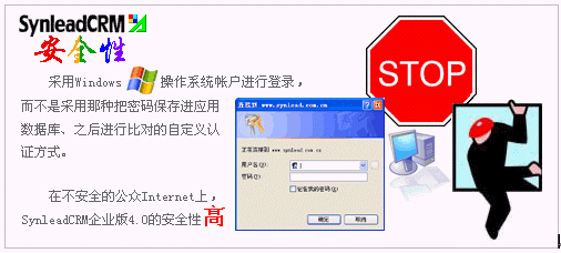 SynleadCRM企業(yè)版4.0采用了高度捆扎操作系統(tǒng)安全性的域帳戶認(rèn)證,而不是在應(yīng)用層面自定義用戶認(rèn)證策略。事實上,SynleadCRM從一開始就基于這種安全機(jī)制并且不斷完善,以避免今后無法向更高端邁進(jìn)。