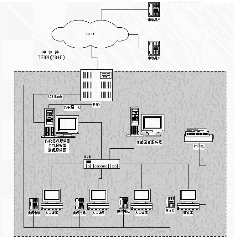 系統(tǒng)目前共設(shè)置了多個人工座席,每人工座席有電腦一臺,耳機式電話一部。人工座席的電腦與CTI,IVR語音服務(wù)器及數(shù)據(jù)庫服務(wù)器共處一個局域網(wǎng)內(nèi)。