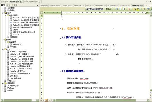 業(yè)務(wù)知識庫系統(tǒng)包括大量的信息,它可以幫助坐席人員精確、及時(shí)地得到相關(guān)知識的詳細(xì)信息。坐席人員可以利用業(yè)務(wù)知識庫系統(tǒng)提供的多種查詢手段,進(jìn)行各種信息的查詢。管理人員還可以通過知識庫訪問量統(tǒng)計(jì)來了解座席員訪問知識庫的情況,并且可以通過知識庫資料維護(hù)來靈活定制知識庫的內(nèi)容。
