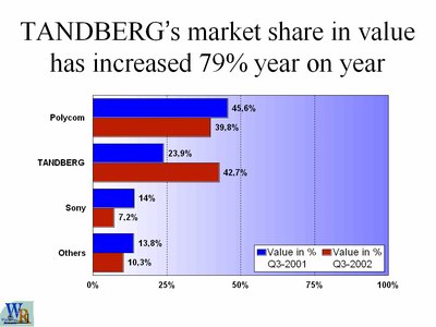 產(chǎn)地挪威,該品牌為視頻會(huì)議業(yè)界的高端產(chǎn)品。該品牌全系列均屬第三代產(chǎn)品,具有多項(xiàng)視頻會(huì)議的首創(chuàng)技術(shù),最高功耗只有65W,最高帶寬3M,是美國國防部、加拿大國防部、聯(lián)合國教科文組織、歐洲多個(gè)國家王室及大型跨國集團(tuán)選用的品牌,F(xiàn)在全球市場占有量第一位(依據(jù)2002年第3季度資料)。
