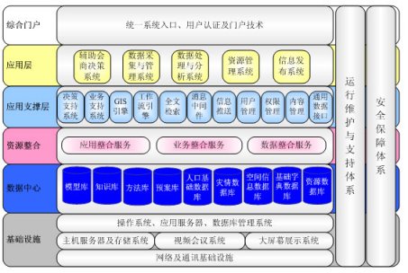 整個系統(tǒng)的底層是信息系統(tǒng)的基礎(chǔ)設(shè)施,這包括網(wǎng)絡(luò)及通訊設(shè)施、主機(jī)服務(wù)器及存儲系統(tǒng)、視頻會議系統(tǒng)、大屏幕數(shù)據(jù)演示系統(tǒng),以及操作系統(tǒng)、數(shù)據(jù)庫管理系統(tǒng)及網(wǎng)絡(luò)通訊基礎(chǔ)設(shè)施等,這些是系統(tǒng)最基本的運(yùn)行基礎(chǔ)。