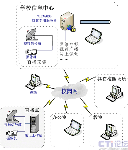 流媒體技術(shù)在中小學(xué)教學(xué)中的應(yīng)用只是其在教育應(yīng)用中的一種,整個應(yīng)用都可以通過流媒體服務(wù)平臺來實現(xiàn)。