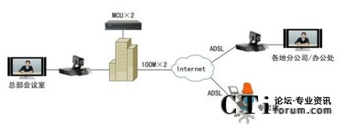 整個方案在部署上極其簡單,紅豆集團總部架設(shè)一臺KDV8000C多點控制單元和一臺KDV8000E多點控制單元,全國各地分公司/辦事處的會議室各部署一套TrueSens硬件視頻會議終端,而遍布全國的紅豆男裝專賣店、軒帝尼專賣店內(nèi)則分別部署一套科達軟件視頻會議終端。集團總部采用電信、聯(lián)通的百兆寬帶各一條,各地的分支機構(gòu)和專賣店則均通過普通的ADSL接入。系統(tǒng)拓撲圖如下: