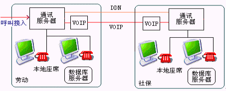 如某些城市勞動(dòng)和社保是業(yè)務(wù)分開(kāi),為共用12333接入號(hào)可采取此種方式,在呼叫首次接入時(shí)提示用戶(hù)選擇勞動(dòng)、還是社保咨詢(xún)服務(wù),如果選擇社保服務(wù)則通過(guò)DDN專(zhuān)線(xiàn)或VOIP將呼叫接入到社保的交換機(jī)中。