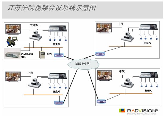 RADVISION為江蘇法院建立的視頻會議系統(tǒng)解決方案配備1臺RADVISION ViaIP400 MCU,建設(shè)容量為13點的2M會議,系統(tǒng)支持不同需求的會議模式,包括研討型會議、遠程法庭、遠程審判、大型講演型會議和培訓等,會議資源由江蘇法院集中控制和調(diào)度。在安全性、技術(shù)先進性、可擴展性、易操作性和經(jīng)濟性等方面,RADVISION視頻會議系統(tǒng)都做了充分的考量。