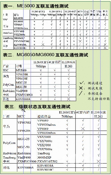 眼見為實,為了驗證H3C視訊產(chǎn)品的互聯(lián)互通性,我們對其進(jìn)行了實際測試;ヂ(lián)互通性屬應(yīng)用級特性,測試起來并不困難,但有些煩瑣。由于視訊系統(tǒng)核心組件通常包括MCU和視訊終端兩類設(shè)備,兼容性互有交叉,因此我們將測試分成3組進(jìn)行。參與測試的設(shè)備除H3C的MCU(多點控制單元)ME5000和視訊終端MG6050/MG6060外,還包括其它5個廠商的7款MCU和8款視訊終端。
