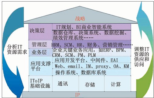 按照華為3Com的構(gòu)想,如果把整個(gè)IT系統(tǒng)比做一座房屋,那么整個(gè)房屋的地基就是IP網(wǎng)絡(luò),需要基于IP網(wǎng)絡(luò)來構(gòu)建通信、存儲(chǔ)、計(jì)算等IT基礎(chǔ)設(shè)施。在這些基礎(chǔ)設(shè)施之上,則是應(yīng)用支撐平臺(tái)(操作系統(tǒng)、數(shù)據(jù)庫系統(tǒng)、應(yīng)用開發(fā)平臺(tái)等),基于應(yīng)用支撐平臺(tái)提供給機(jī)構(gòu)的關(guān)鍵業(yè)務(wù)流程信息系統(tǒng)(如ERP、SCM等),最終為用戶的管理和決策提供支持。“在戰(zhàn)略與IT基礎(chǔ)設(shè)施之間實(shí)現(xiàn)實(shí)時(shí)同步互動(dòng),IT為用戶高層提供商業(yè)智能系統(tǒng)、決策系統(tǒng),以便決策層即時(shí)掌握信息,作為機(jī)構(gòu)戰(zhàn)略決策、戰(zhàn)略挑戰(zhàn)的依據(jù);用戶可以依據(jù)內(nèi)、外部變化,進(jìn)行戰(zhàn)略調(diào)整時(shí)快速分析新的IT資源需求,同步調(diào)整IT資源的配置,從而使IT與業(yè)務(wù)戰(zhàn)略保持同步。”這正是IToIP的基本理念。