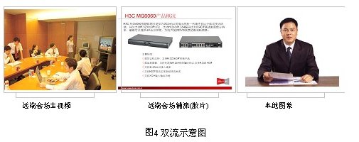 雙視頻流傳輸是指同時(shí)傳輸兩路動態(tài)視頻到各分會場:雙流是指分會場能夠?qū)⒈緯䦂龅膬陕芬曨l同時(shí)傳輸?shù)組CU上,MCU 能夠?qū)陕芬曨l同時(shí)傳輸?shù)礁鞣謺䦂。ME5000與MG6060配合可以將終端第二路視頻傳輸?shù)狡渌麜䦂,適用于在開會的同時(shí),對文件、圖片講解,使會議更加生動,內(nèi)容更加豐富。