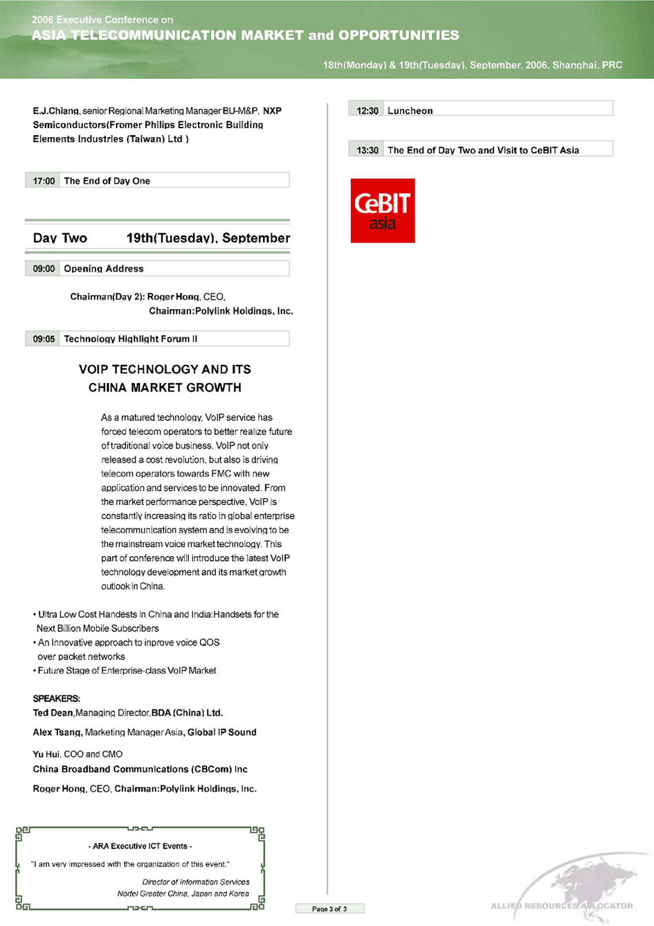 Polylink總裁應(yīng)邀擔(dān)任2006亞洲CeBIT“VoIP技術(shù)以及亞洲市場(chǎng)發(fā)展?fàn)顩r”論壇主席