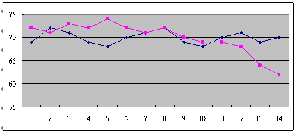 這是兩個(gè)座席員每天的通話利用率,橫軸是這個(gè)月從1號(hào)開始到14號(hào),縱軸是通話利用率,藍(lán)色這位的平均通話利用率在70左右,粉紅色這位的平均通話利用率也是在70左右,但上下震蕩的很厲害,月初表現(xiàn)的很好,但從月中開始,通話利用率就一直明顯的下降。