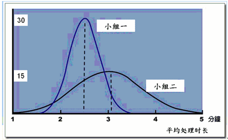 上面這張圖中,小組一的平均處理時(shí)長(zhǎng)的標(biāo)準(zhǔn)差,顯然低于小組二,也就是小組一的座席員,大家處理時(shí)長(zhǎng)差距都不大,都在2.5分鐘左右。