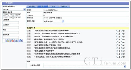呼叫中心質(zhì)量管理最重要的工作之一,就是評(píng)核各類(lèi)型業(yè)務(wù)電話服務(wù)的質(zhì)量。為了要做到公平與公正,質(zhì)檢樣本的篩選不只要相同業(yè)務(wù)服務(wù)內(nèi)容,更要相同的 環(huán)境條件,例如:不同業(yè)務(wù)類(lèi)別(成交電話篩選、抱怨電話篩選)、日期(尖峰日電話篩選、離峰日電話篩選)提供公平的選擇基礎(chǔ)作為評(píng)核的樣本,不因隨機(jī)取樣造成對(duì)客服人員整體績(jī)效評(píng)估失之偏頗。即便呼叫中心因應(yīng)企業(yè)策略產(chǎn)生新的業(yè)務(wù)服務(wù)時(shí),QMS8100KS可充分整合前端應(yīng)用系統(tǒng)的改變,可依據(jù)所需的篩選條件組合或與CTI整合后的篩選字段,完成交叉錄音檔案篩選。