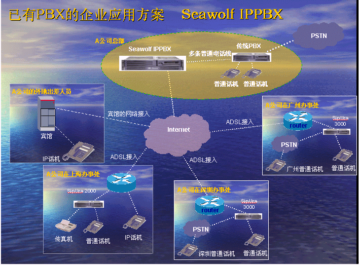北京海狼網(wǎng)絡(luò)通信有限公司推出的Seawolf IPPBX解決方案切實從集團(tuán)企業(yè)的利益出發(fā),為客戶成功地降低了通訊成本。Seawolf IPPBX是一款功能強大的小型語音交換平臺設(shè)備。它將傳統(tǒng)的交換機技術(shù)與VOIP的先進(jìn)技術(shù)完美融合,提出了VOIP的企業(yè)級解決方案。此方案能大大縮減各大、中、小型企事業(yè)單位的通信費用,同時增加員工的工作效率。隨著產(chǎn)品的不斷普及,Seawolf IPPBX將成為企業(yè)辦公不可缺少的一部分。此方案適合于已經(jīng)有PBX的公司,由于先期已經(jīng)投入了PBX設(shè)備,費用昂貴,所以不會輕易被替換。在外地有多家分公司,使用傳統(tǒng)電話通訊費用很高,希望能降低成本。并希望在分公司所在城市可以通過當(dāng)?shù)氐腜STN落地,節(jié)省長途費用。依照客戶的需求,我們制定了以下方案:海狼科技公司供稿 CTI論壇編輯