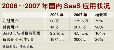 計世資訊《2007-2008年軟件運營服務市場研究報告》數(shù)據(jù)顯示,2007年管理型SaaS應用市場規(guī)模為4.5億元人民幣,付費企業(yè)用戶數(shù)為26萬,企業(yè)年平均消費水平僅為2000元/年,其中近八成用戶年平均消費低于2000元。目前國內SaaS的用戶群仍以中小企業(yè)用戶為主,不過SaaS提供商Saleforce的加入有望改變這一現(xiàn)狀。