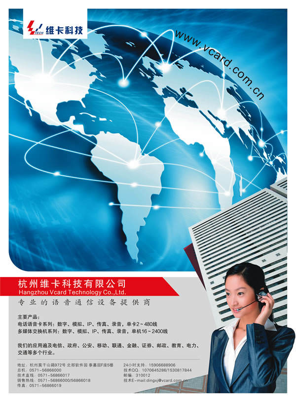 維卡科技有限公司(簡(jiǎn)稱“維卡科技”)成立于2004年,是一家以下一代網(wǎng)絡(luò)通信為發(fā)展方向的高科技企業(yè),公司成立于上海,在杭州設(shè)立研發(fā)和生產(chǎn)基地,公司主要從事通信和語(yǔ)音產(chǎn)品的研究、開發(fā)、生產(chǎn)及銷售,是國(guó)內(nèi)通信語(yǔ)音產(chǎn)品―――電話語(yǔ)音卡的核心供應(yīng)商之一。公司匯集一批多年從事CTI技術(shù)研究的高級(jí)專業(yè)人才,堅(jiān)持自主創(chuàng)新,自主研發(fā),不斷推出適合人性化的一流產(chǎn)品,經(jīng)過(guò)短短幾年的發(fā)展,公司的語(yǔ)音卡產(chǎn)品已經(jīng)躋身全國(guó)三強(qiáng),為中國(guó)的CTI行業(yè)貢獻(xiàn)了一份力量。