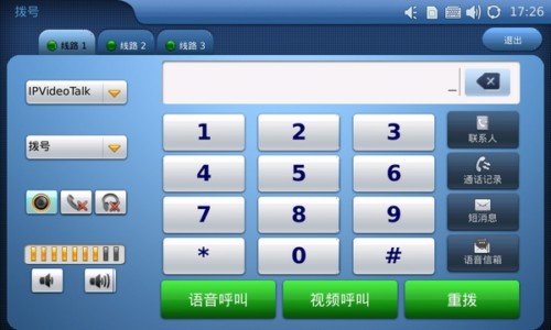 7寸大屏搭配寬大的數(shù)字虛擬鍵盤,讓你的撥號(hào)準(zhǔn)確無(wú)誤。同時(shí)界面的所顯示的通話功能諸如查找聯(lián)系人、查找通話記錄、發(fā)送短消息或者快速進(jìn)入語(yǔ)音信箱等功能也清晰明了?梢园l(fā)現(xiàn)的是,用戶在輸完號(hào)碼之后可自主選擇采用語(yǔ)音呼叫還是視頻呼叫。另外,同潮流網(wǎng)絡(luò)之前的一款視頻電話GXV3140一樣的是,GXV3175也在出廠自帶了一個(gè)IPVideoTalk賬號(hào)。該賬號(hào)是出廠時(shí)就已配置好的,每一臺(tái)電話配備一個(gè)號(hào)碼并顯示在桌面上。也就是說(shuō),用戶在拿到GXV3175并聯(lián)網(wǎng)之后即可使用該賬號(hào)撥打免費(fèi)的視頻電話了。這可是很多廠商所沒(méi)有的特殊功能。下面我們就使用隨機(jī)附送的IPVideoTalk賬號(hào)來(lái)?yè)艽蛞曨l電話。