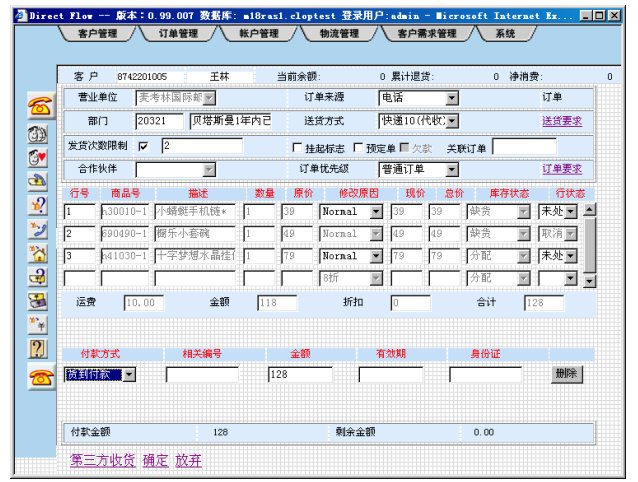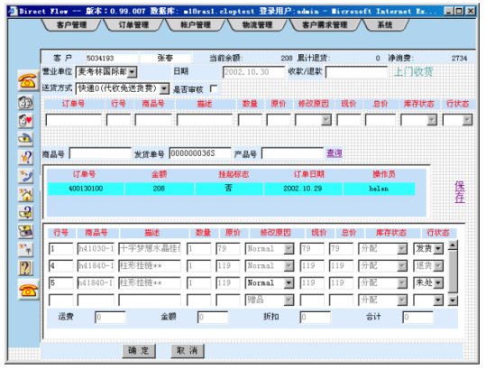 客戶根據(jù)麥考林提供的產(chǎn)品目錄告訴座席代表所需的產(chǎn)品和數(shù)量,并說明送貨方式、付款方式等信息,CRM軟件會自動計(jì)算客戶的消費(fèi)金額,如果是老客戶或增在進(jìn)行促銷活動,軟件會自動計(jì)算相應(yīng)的折扣。如果某種產(chǎn)品缺貨,系統(tǒng)將告訴座席代表,并提供最近到貨日期供客戶參考。購買麥考林的許多商品,會有一些小禮品贈送,CRM軟件會根據(jù)客戶訂單列出客戶可以選擇的小禮品供客戶選擇。訂單輸入完成后進(jìn)行訂單入庫操作,并根據(jù)訂單的屬性自動生成相關(guān)工單派發(fā)有關(guān)部門。