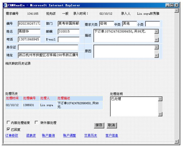 客戶向麥考林定購商品的最常用途徑就是電話訂貨,客戶撥打麥考林服務(wù)熱線進(jìn)入客服系統(tǒng)。系統(tǒng)會根據(jù)客戶的主叫號碼對客戶進(jìn)行識別,如果識別成功,座席代表屏幕上會自動彈出客戶資料和以往訂貨記錄;如果識別失敗,座席代表可以根據(jù)客戶通報的客戶代碼或姓名等信息查詢客戶資料。如果是新客戶,座席代表可以立即為他創(chuàng)建客戶檔案。