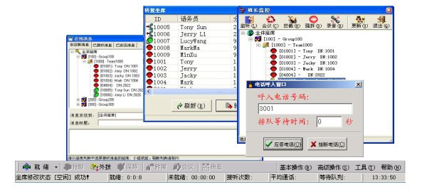 擁有管理員使用許可的桌面工具提供了比一般座席使用許可更加強(qiáng)大的功能,它不僅允許管理員對所屬座席進(jìn)行監(jiān)控、監(jiān)聽、強(qiáng)插、強(qiáng)拆等特殊操作,還可以進(jìn)行消息的組播、廣播,以及更改LED大屏幕顯示內(nèi)容等操作。另外,座席的新增、刪除、分組等操作也必須由管理員工具來完成。