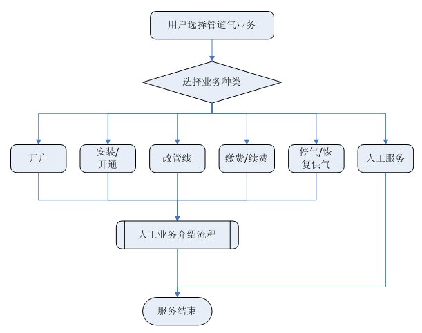 業(yè)務(wù)咨詢:用戶通過人工、自動(dòng)語音等方式咨詢有關(guān)政策法規(guī)、資費(fèi)標(biāo)準(zhǔn)、用氣常識(shí)、報(bào)裝方法等,系統(tǒng)以語音、傳真、Email、短消息等方式回復(fù)客戶。