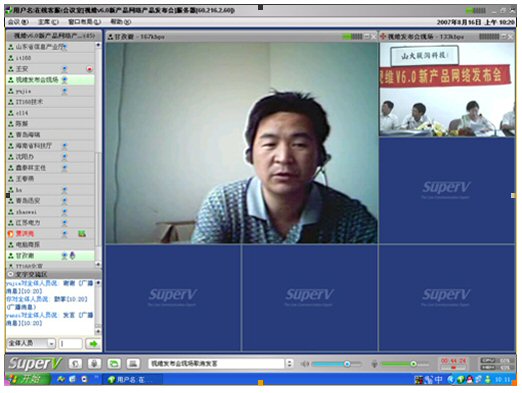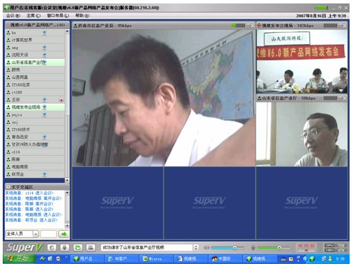 2007年8月16日,視維視頻會議V6.0新產品網絡發(fā)布會在美麗的泉城濟南舉行,山東省信息產業(yè)廳、濟南市信息產業(yè)局的領導、山東省電信等上級主管部門領導,視維產品新老用戶和有視頻會議需求的潛在客戶,國內外合作伙伴,IT168、中國計算機報、電腦商報、C114、支點網、計算機世界、CTI論壇、投影時代等國內知名媒體100多人參加了這次網絡發(fā)布會。在此次會議上,山大聯潤公司通過視頻會議與各地與會者進行了良好的溝通,同時這次發(fā)布會開創(chuàng)了用視頻會議發(fā)布新產品的先河。
