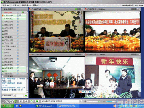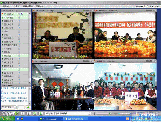 春節(jié)是中華民族的傳統(tǒng)的節(jié)日,尤其是跨國企業(yè)集團,身在海外的游子們,這一刻多么期待與在國內(nèi)的親人、朋友、以及同事網(wǎng)絡(luò)“面對面”的過春節(jié);因此,一些企業(yè)用視維視頻會議舉辦了別開生面的視頻拜年會。其中京信通信公司視頻年會尤為精彩,廣州科學(xué)城的主會場、廣州開發(fā)區(qū)、香港、北京、上海、西北分公司、武漢等20多個分公司通過視維視頻會議互拜大年,通過網(wǎng)絡(luò)視頻,遠隔千里一樣可以“面對面”的送上新春祝福。如下圖: