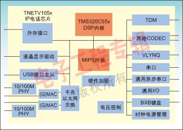 TI提供全面的VoIP解決方案,覆蓋IP電話、家庭網(wǎng)關(guān)、電信級網(wǎng)關(guān)以及VoADSL和VoCable。針對企業(yè)級IP電話需求,TI提供了多種解決方案,其中TNETV1050/TNEV1055的SoC方案基于TI的TMS320C55x DSP系列的可編程DSP和增強(qiáng)的32位MIPS內(nèi)核。它使用先進(jìn)的系統(tǒng)架構(gòu),在提供高性能低功耗的同時(shí),兼顧系統(tǒng)的可擴(kuò)展性,還包括豐富的外設(shè)接口,滿足設(shè)計(jì)企業(yè)級電話系統(tǒng)的要求。