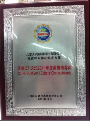 CTI論壇(ctiforum)1月13日消息(記者 潘婷婷): 近日, CTI論壇舉辦的“CTI論壇2011年度編輯推薦獎”評選活動落下帷幕,天潤融通的解決方案成功斬獲了CTI論壇編輯推薦獎。