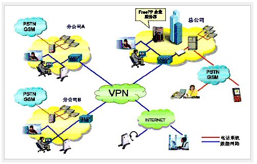 FreePP獨(dú)有的群組功能可以幫助企業(yè)將其總部與分支機(jī)構(gòu)原本各自獨(dú)立的若干個(gè)PBX整合成為一個(gè)PBX,實(shí)現(xiàn)Internet、PSTN網(wǎng)絡(luò)上通信應(yīng)用的融合,幫忙企業(yè)擺脫對傳統(tǒng)通信運(yùn)營商的依賴,完全掌握自己的通信網(wǎng)絡(luò)。通過為PBX外線上的若干個(gè)FreePP Box (或MPES)分配一個(gè)Group Number,PBX內(nèi)線上的分機(jī)按照PBX上的設(shè)定來獲取Group Number中的一個(gè)FreePP Box,進(jìn)而通過這個(gè)FreePP Box來呼叫另外一組Group Number 連接的PBX分機(jī)號(hào)碼。他們相互間的通信完全基于Internet實(shí)現(xiàn),無需象傳統(tǒng)方式那樣交納通信費(fèi)用。