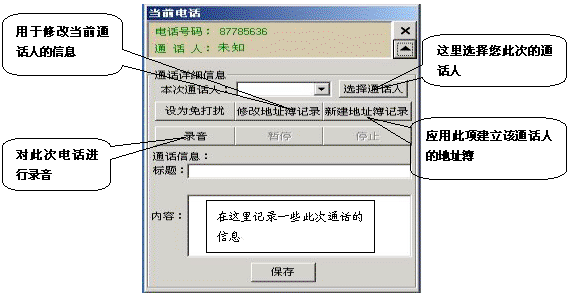 如果有電話打入時,在屏幕的右側(cè)會彈出一個對話框,它顯示了當(dāng)前來電的號碼和通話人(如果在地址簿中沒有記錄則顯示為未知),點擊彈出全部菜單功能,它相當(dāng)于一個功能強(qiáng)大的通話記事本,用它既可以邊接聽電話邊整理相關(guān)通話的文字記錄,又可以錄下通話的全部內(nèi)容。如果這個電話是您不愿接聽的,也可以將它設(shè)置為“免打擾”,這樣,這個號碼以后將存入免打擾名單中,若此號碼再呼入,系統(tǒng)將自動掛斷此呼叫。如果這個電話是您認(rèn)為的重要客戶打過來的,您也可以將此號碼添加到重要客戶組中,以便您今后接聽或設(shè)置電話轉(zhuǎn)移時能與其它呼入電話相區(qū)分。